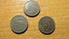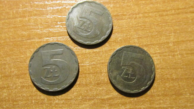 Trzy obiegowe monety PRL (orzeł bez korony) o nominale 5zł; wydanie: 1983, 1987, 1988 (stan widoczny na zdjęciach)