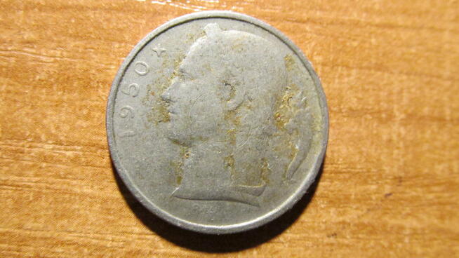 Unikatowa moneta belgijska 5 franków 1950, awers: głowa Ceres - data po lewej; krawędź żłobiona, rewers: korona nad ...