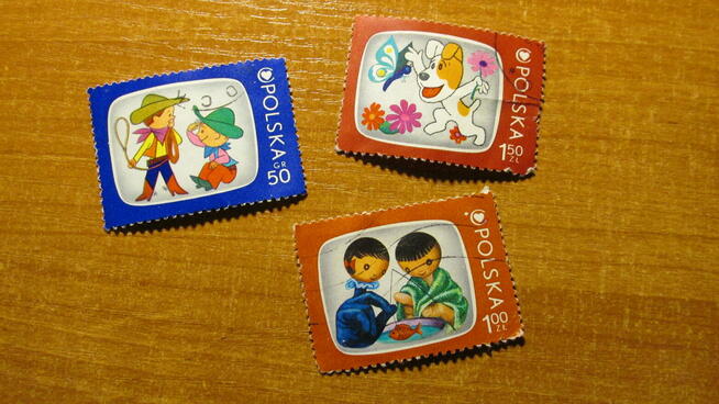 Trzy znaczki PRL - dobranocki; seria: *telewizyjne filmy dziecięce* - Bolek i Lolek, Reksio, Jacek i Agatka; znaczki ...